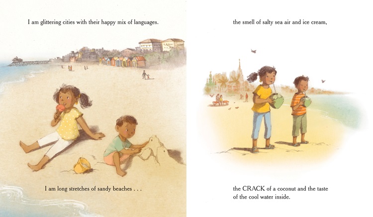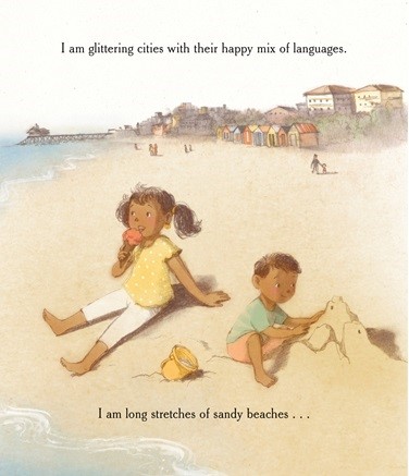 Ruchi Mhasane’s image of two children on a beach from This is Who I Am (Andersen Press). The lone and level sands stretch far away, the effect achieved by the accepted device of larger figures in the foreground and much smaller ones which are further from us. The smaller the distant figures, the longer we understand the beach to be.