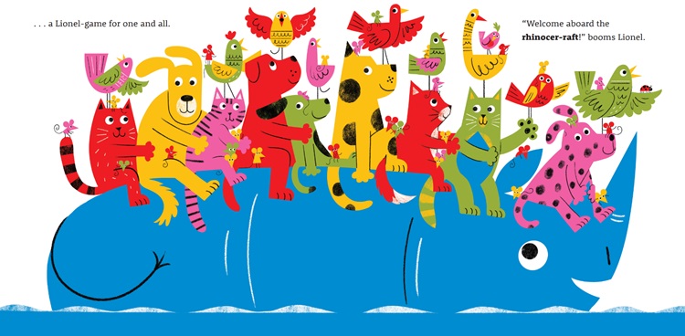 An example of this might be the image I chose from Lou Cole’s picturebook Lionel (Rocket Bird Books) in which a parade of animals rides on the back of a rhinoceros. The colour is completely flat, the background is white, and nothing seems to stretch away from us. This bears no resemblance at all to an Ardizzone interior, nor to Shirley Hughes leading you round the playground at the school fete in Dogger. The movement is all from left to right as the ‘rhinoce-raft’ carries other creatures along a river.
