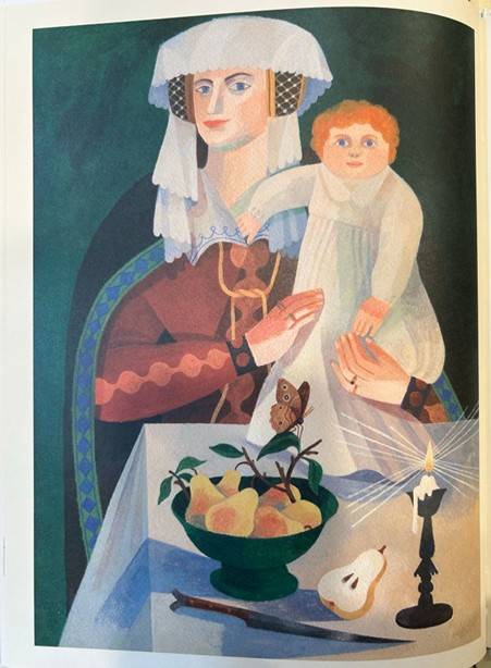 My third choice is by Carson Ellis, illustrating Mac Barnett’s retelling of Rumpelstiltskin (Orchard Books/Scholastic). Ellis is a fan of the Tudors, and this image of the miller’s daughter, now the queen, with her baby, shows the influence. The queen has a ramshorn hairstyle (the mediaeval precursor of Princess Leia’s coiled side buns) encased in ornate mesh nets called crispinettes, or crespines, and draped with a fine cloth ‘templar’. There is something here of Holbein’s famous portrait of Anne of Cleeves, with the headdress extending out to the sides. The figures are daringly in the attitude of a different subject, though: a Madonna and Child, with the baby’s hand (as was common) reaching inside the mother’s dress. Red hair was often also a feature of Renaissance paintings, from Michaelangelo (the first time round) to Millais (revisiting).