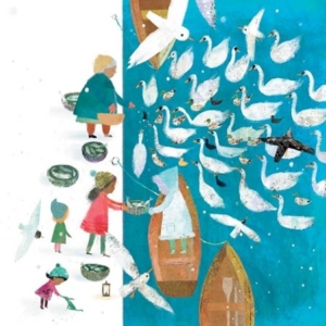 The overall effect is glorious, with a somewhat retro style in the elf-like figures, and a quality of John Burningham’s work in the whole. It adds up to a celebration of nature, light, togetherness, snow, water and dreams. It would be a happy picture to live with on a wall.