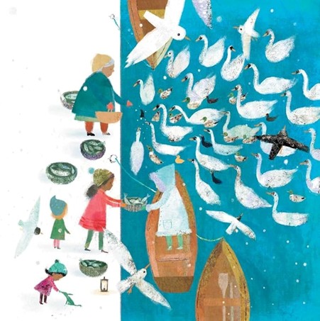 This is in fact half a spread, the white background blending into a snowy mountainside on the left-hand page. The scattered feed that causes the birds to gather also merges with what could be spots of snow falling on both parts of the scene. The most exhilarating aspects of this picture though are the colour and the composition, the pattern of swans, ducks and gulls, mostly white against the turquoise, perfectly offset by the black coots and the dark bird flying in. And the red coat balancing the eau de nil makes the colour zing. (Although the colour is strong, it is also softened with textures – of feathers, fish, basket weave, woolly hats and wooden boats.) Meanwhile the absolutely vertical line that marks the edge of the quay is placed at the Golden Mean, which is perhaps why the arrangement is so satisfying. The beautifully-spaced flock, too, makes a near-circle, herded by the little boats, with more birds flying in.