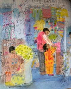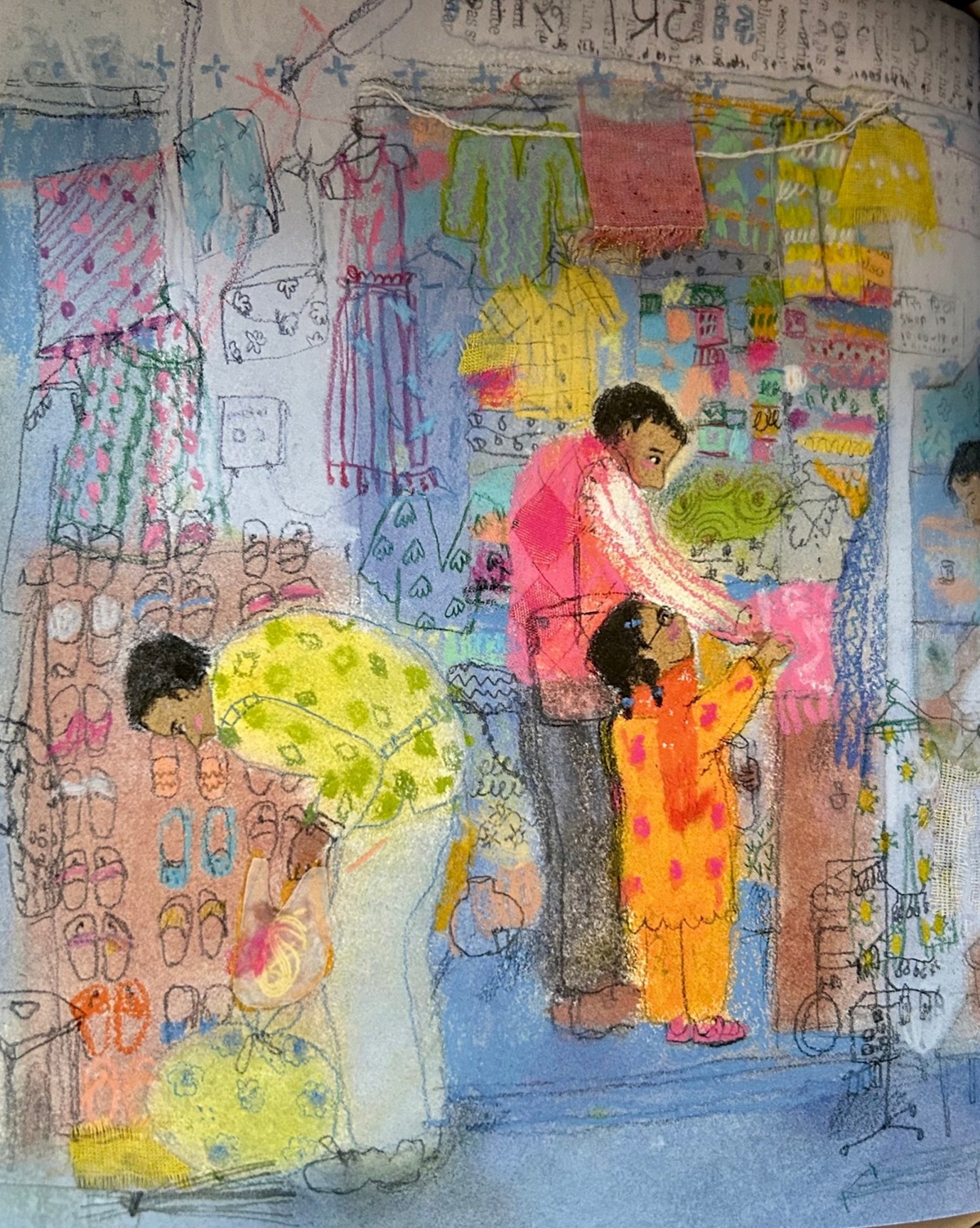 The same is true of my second choice, from Aditi Anand’s The Fabric of Us (Walker), again half a spread. Oranges and pinks glow in this scene of a fabric shop in India (where Anand lives), vivid against a soft blue-grey background and vibrating with the intensity of a Mark Rothko. Using pencil crayon and pastel (I think), as well as a few collaged instances of thread, newsprint, fringed fabric and cheesecloth, Anand has made a ravishing image and one to pore over. The shoe rack, the jewellery stand, and the stacked or hanging items of clothing with their patterns make for a busy background without losing points of focus: the figures whose various stances are casually but accurately depicted.