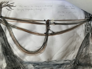 Back at my desk, I grabbed some wool yarn and a paint tube to play the part of the boy, then strung a makeshift ‘hair bridge’ across my wall organiser. I snapped a photo of my DIY props and emailed the team sketches inspired by them. That solved theimage, and the team loved it!