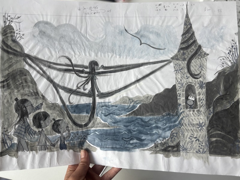 I had just returned from Cornwall, where I visited Tintagel Castle with my family. Crossing a bridge over swirling waters and dramatic cliffs sparked the idea: how could the boy’s hair become a bridge?