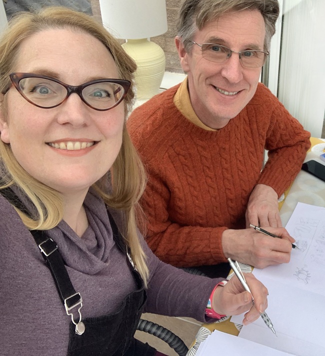 when we needed them. Then he helped me with the early sketches, which we call ‘pencil roughs’. We spent about two days filling spaces in between words, adding little jokes and details as we went.