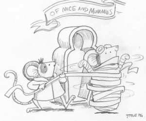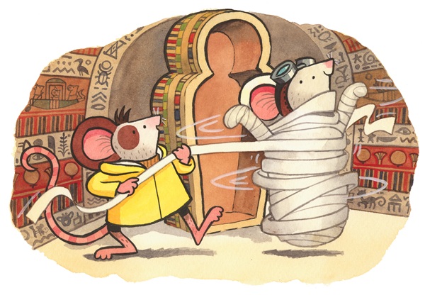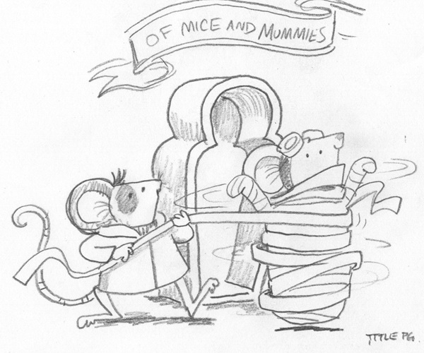 Of the nearly 100 illustrations in the new Adventuremice book, let’s focus on the title page. I love title pages; you see them before you really know what the story will be about, and it’s a clue to what’s going to happen later. One of the most enjoyable things about these books is the growing friendship between Pedro and Fledermaus. This later scene in the story is supposed to be quite serious, when they’re assembling mummy disguises to escape from the baddies, but I had fun showing them mucking about.
